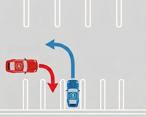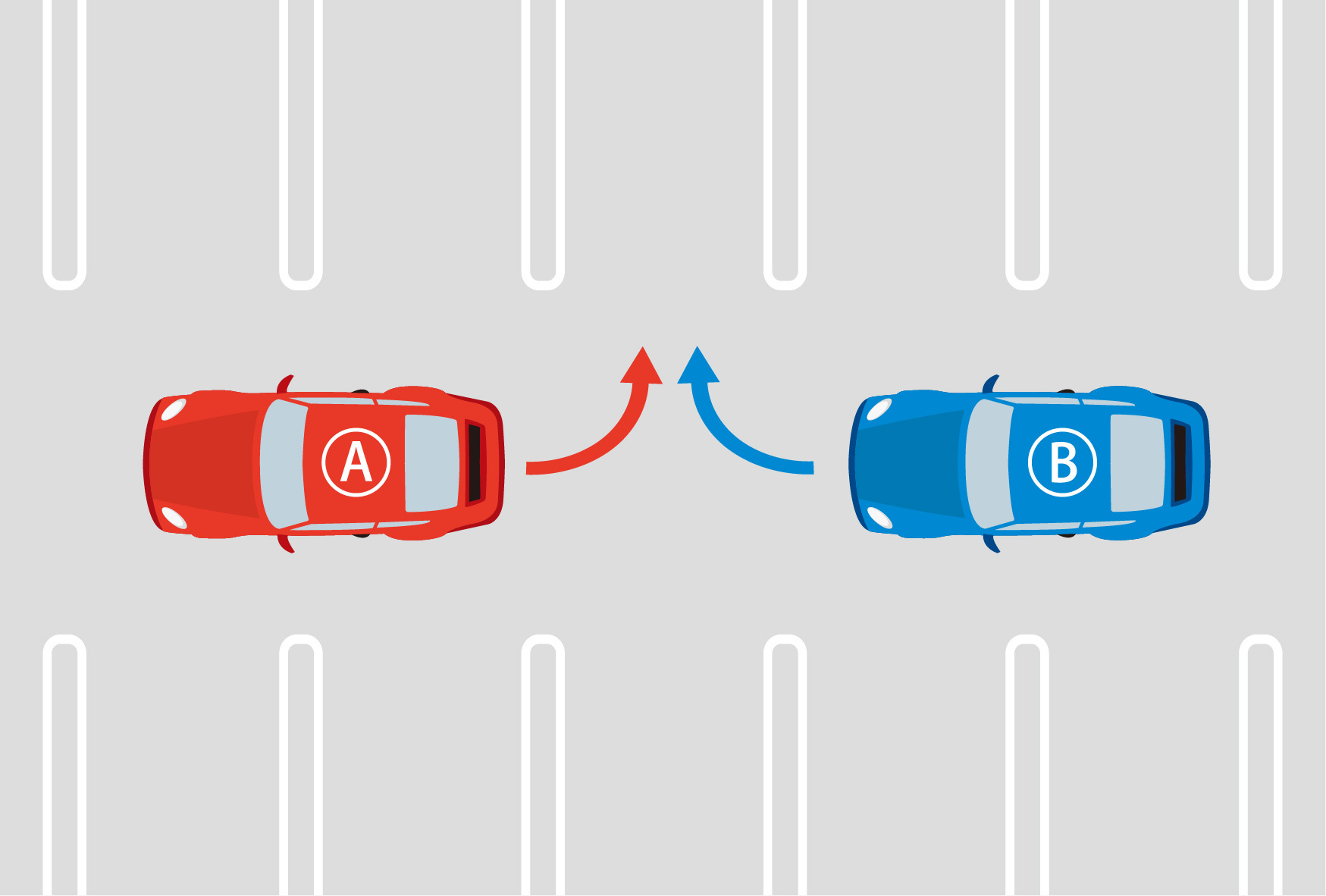 見落とされがちですが、実務上しばしば問題になるのが、いったん駐車区画内に車輪の全てが収まった車両が、駐車位置修正のために再び通路に出てきて、通路進行車と衝突するケースです。